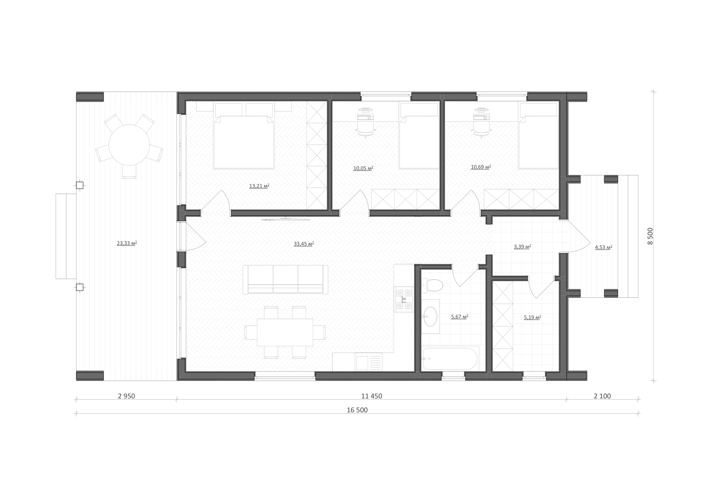 Утепление перекрытия, наружных стен и кровли — 200 мм.