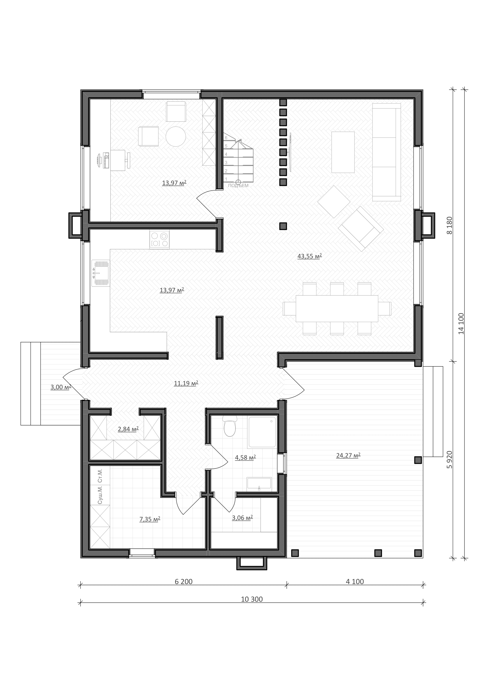 Шумоизоляция внутренних перегородок и межэтажного перекрытия — 100 мм.