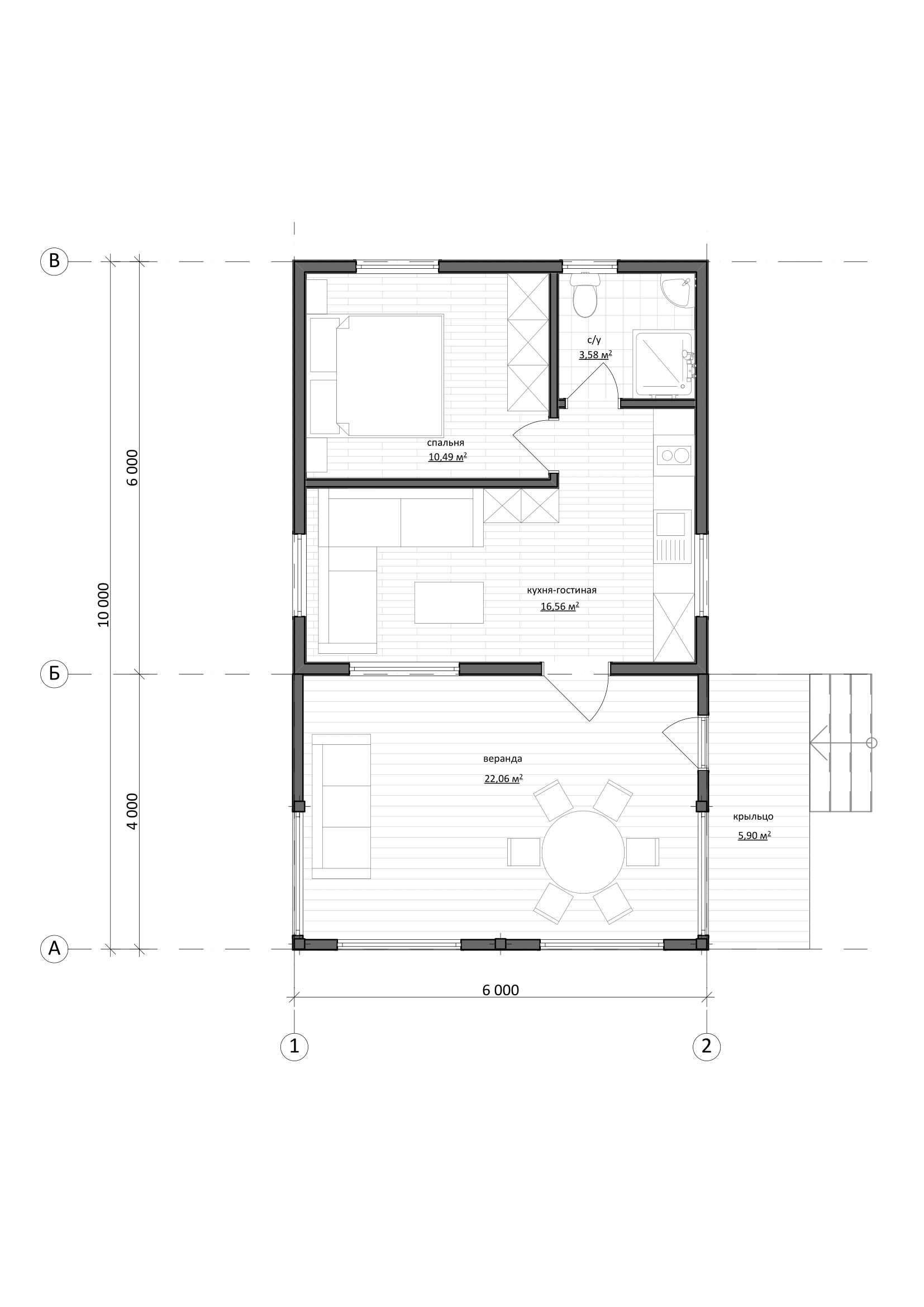 Площадь помещений - 30,5 м2. Площадь закрытой веранды - 22 м2