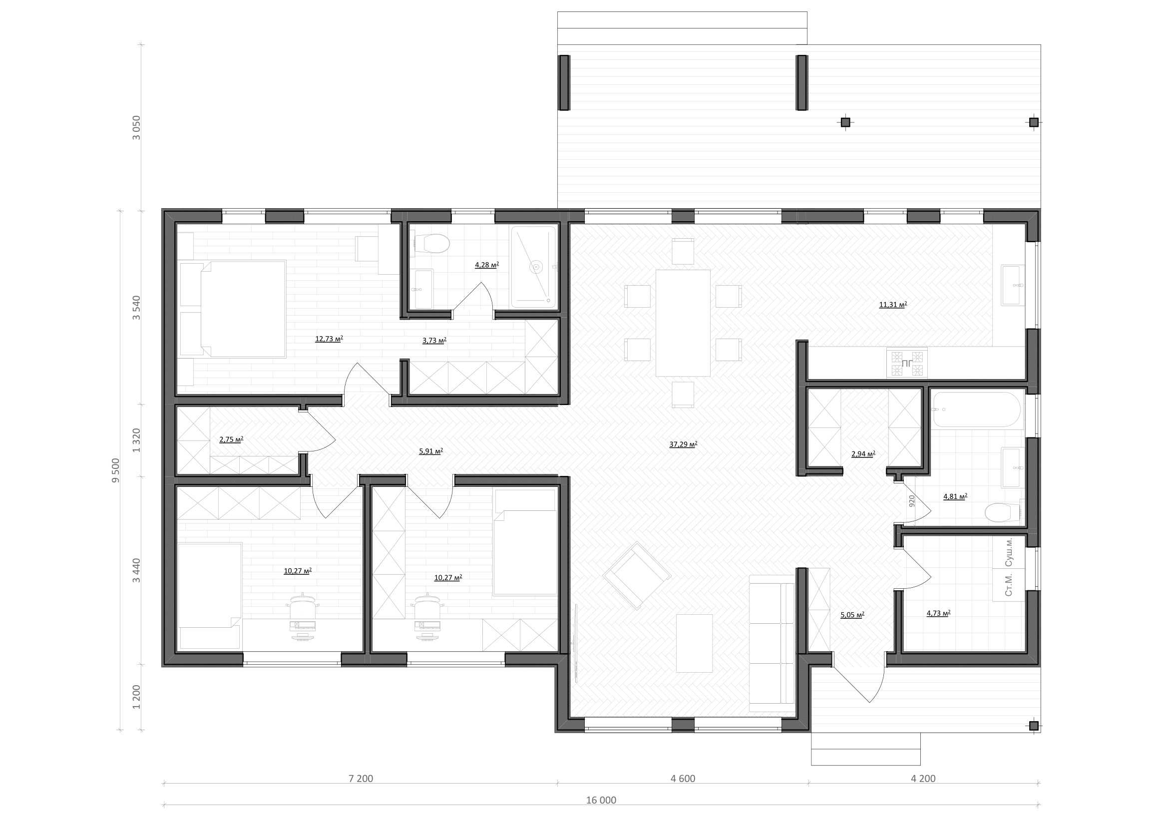 Утепление перекрытий, наружных стен и частично кровли — 200 мм.